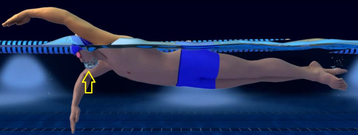 Denke daran, durch das Wasser zu schwimmen und nicht auf ihm. Eine horizontale Körperform sorgt dafür, dass dein Armzug dich nach vorne und nicht nach oben drückt – so wird jeder Zug effektiver.
