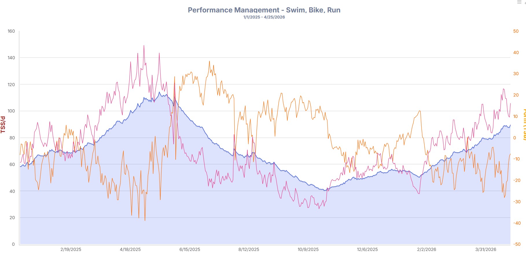 CTL, ATL und TSB werden im sogenannten Performance Management Chart grafisch dargestellt. Dieses Diagramm zeigt die langfristige Entwicklung von Fitness, Ermüdung und Form und macht komplexe Zusammenhänge auf einen Blick verständlich.